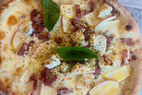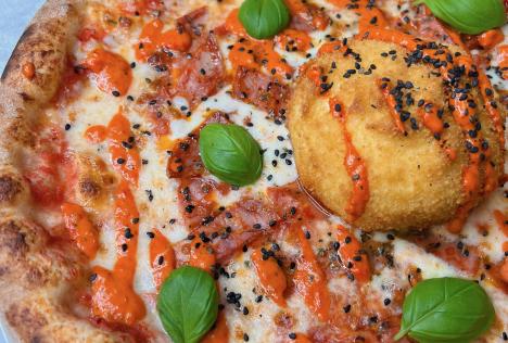 Tomates San Marzano, mozzarella fior di latte, salami piquant, burrata pannée , crème de poivrons et n'duja , sésame noir