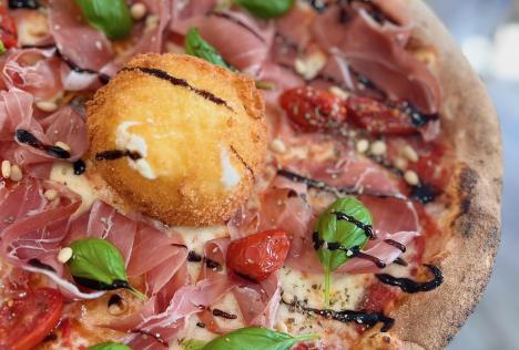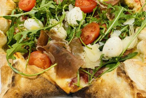Tomates, mozzarella, oignons, roquette, jambon San Daniele, copeaux de parmesan