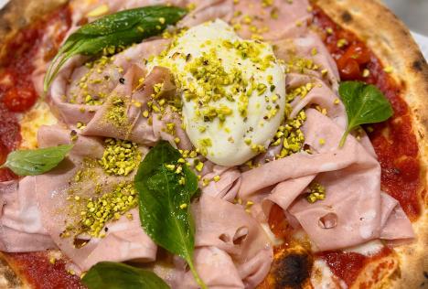 Mozzarella fior di latte, pesto, mortadella, stracciatella, pistaches, basilic frais
