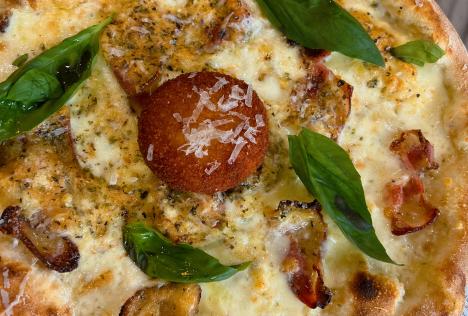 Mozzarella fior di latte, guanciale, oeufs battus , parmesan, croquette de parmesan, pecorino râpé