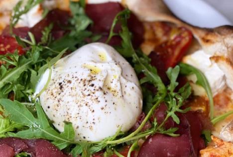 Tomates San Marzano, mozzarella, tomates cerises, roquette, bresaola, huile de truffe blanche, Burrata, croutes fourrées à la ricotta
